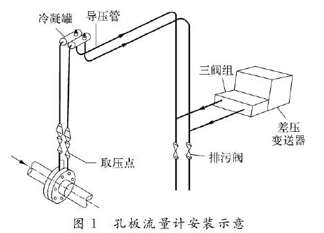 2)安装情况检查。孔板、差压变送器和导压管安装时,正负压侧冷凝罐高度应--致,冷凝罐溢流口位置稍高于取压口。敷设导压管时应保证水平导压管有1:12坡度,使得管道里面充满液体,以免引起测量误差。经检查确认导压管和冷凝罐安装方式无问题,好色先生污版下载安装方式如图1所示。
